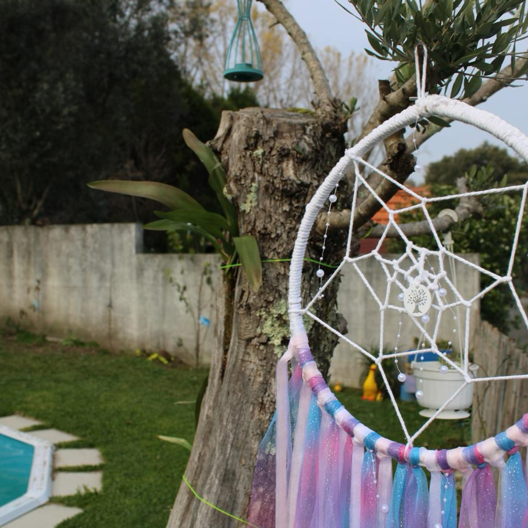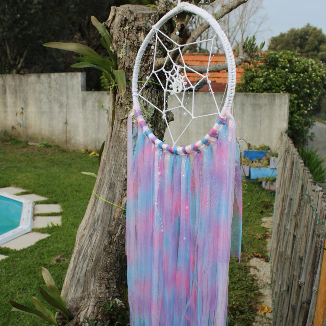 Um verdadeiro sonho em tons pastel, com penas longas em tule rosa, lilás e azul. Este caça-sonhos transmite leveza e magia, sendo perfeito para quartos infantis ou para quem adora uma decoração etérea.
