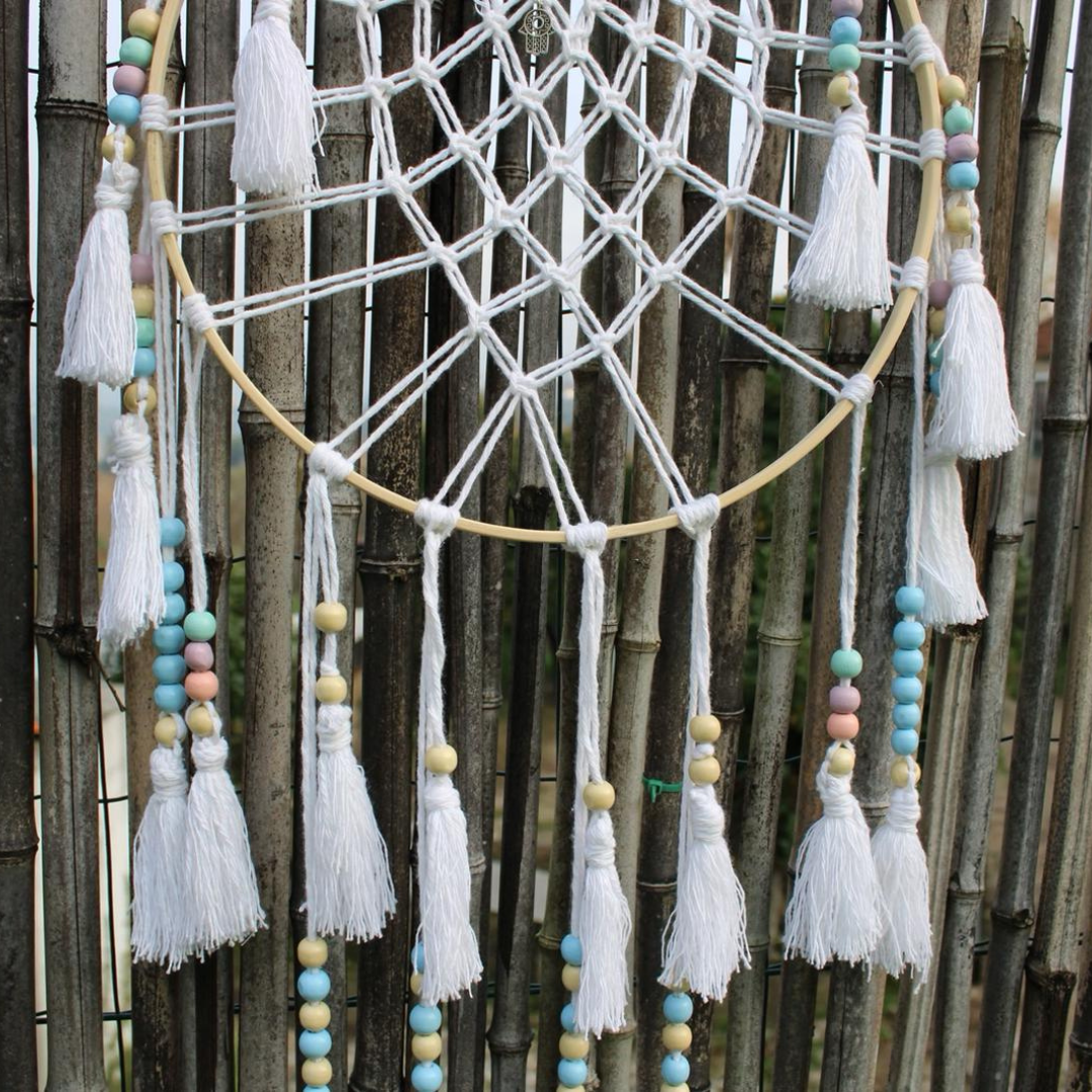 Este clássico caça-sonhos circular, com trama estilo teia e caudas longas em branco com pequenas contas em verde água, é perfeito para purificar a energia do quarto e ajudar a dormir com serenidade.